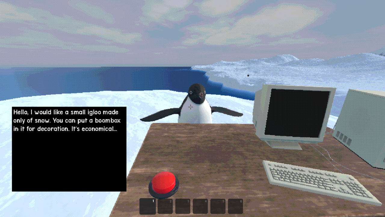 The player takes on the role of a developer stationed on a small, isolated ice floe near Antarctica, cut off from the mainland. Their only possessions are a desk with a computer used to order and unlock new materials, and manage all in-game resources and a cup of coffee.
